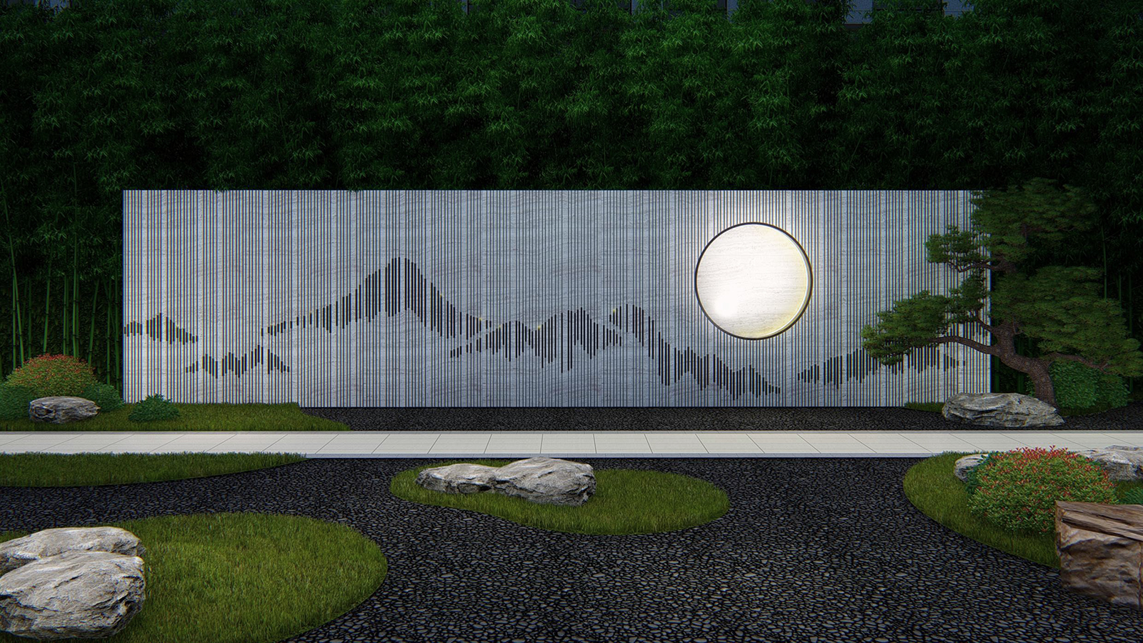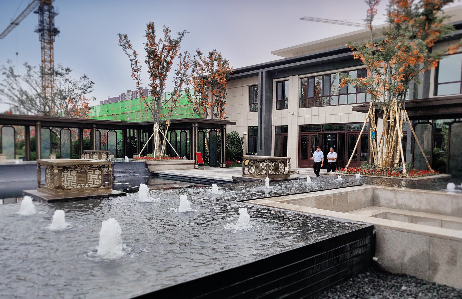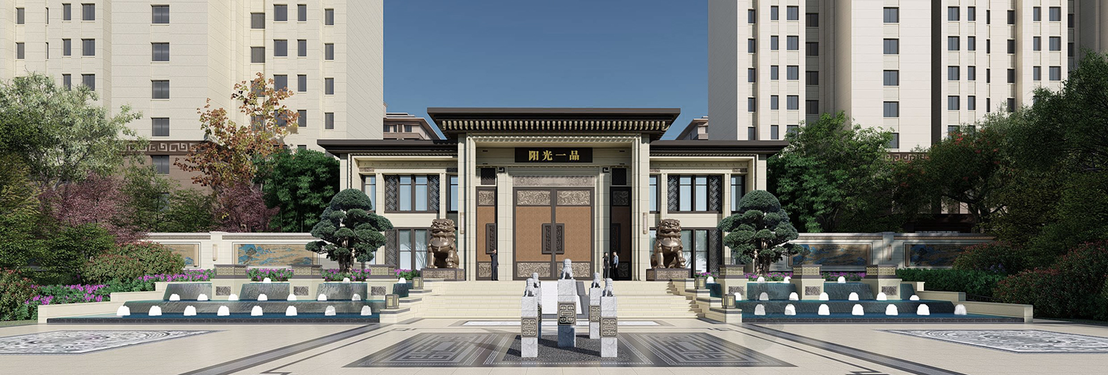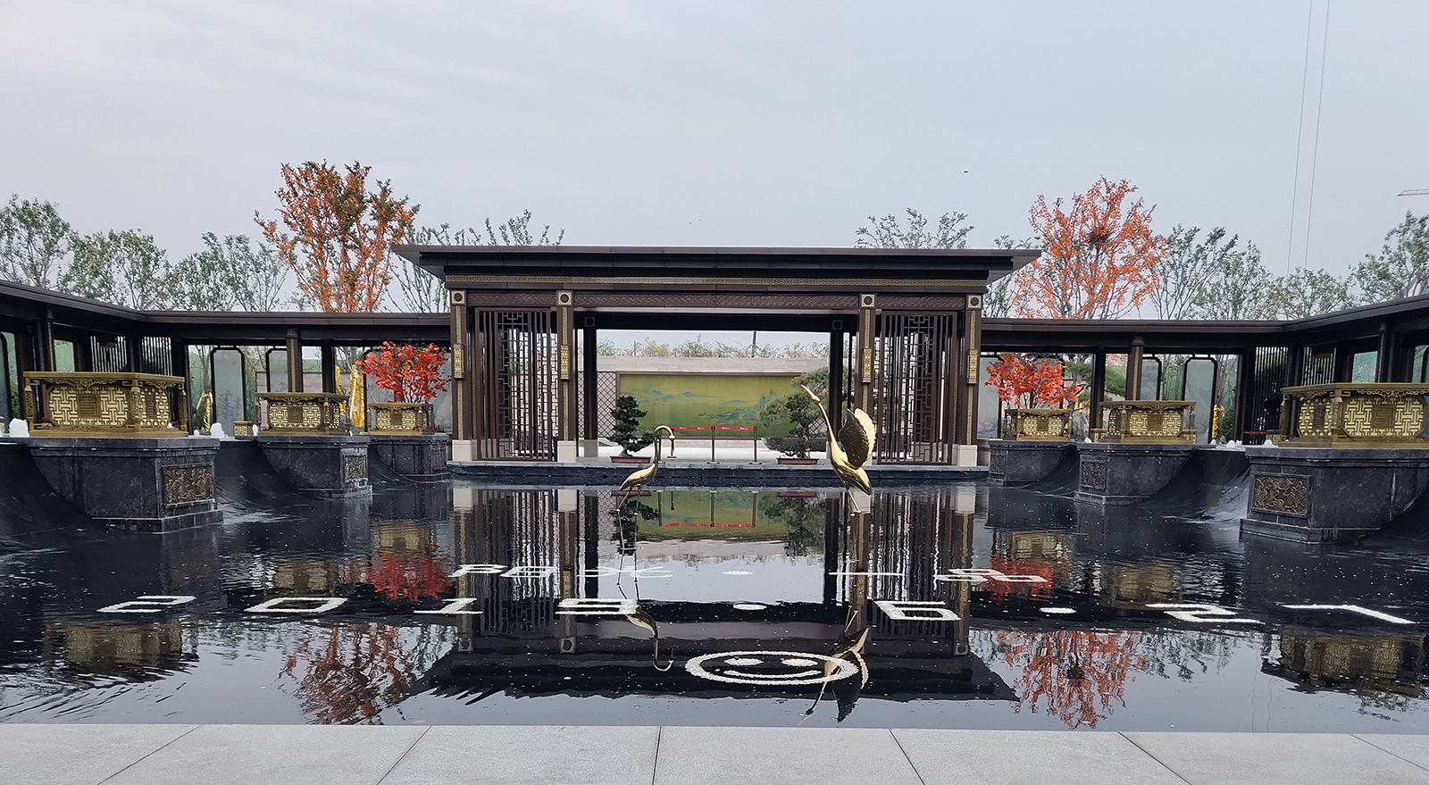 鏡面水景輕靈、優雅、致韻;雙排四座宮燈雕琢萬字符,寓意前程萬福。