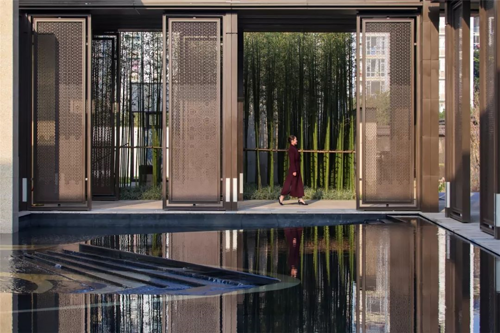 園林是第二自然,我們在庭院內追求山水林泉之樂。以模仿和藝術化處理自然形態為主,創造自然式的園子。以水池為中心,是中國傳統造園的常用手法。明鏡的水面形成寬廣的空間,營造清澈、幽靜、開朗的感覺,池底采用黑色基地,如淵如墨,靜謐深邃,再與曲折的回廊形成開合對比,豐富了觀景感受。