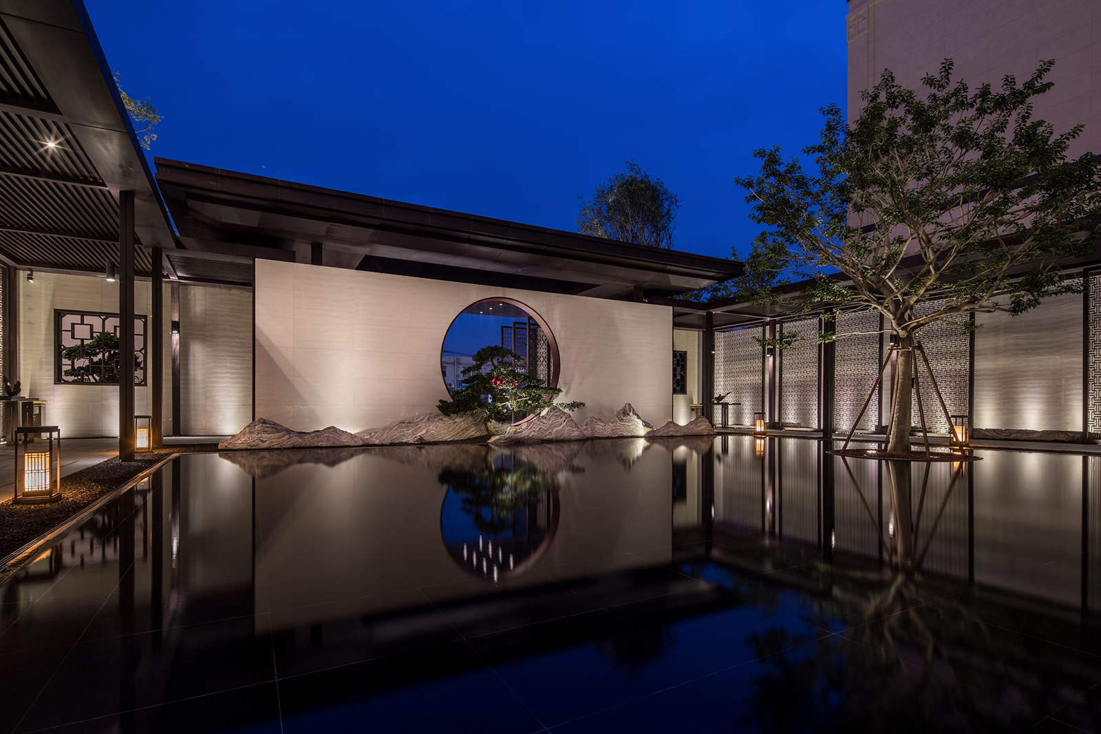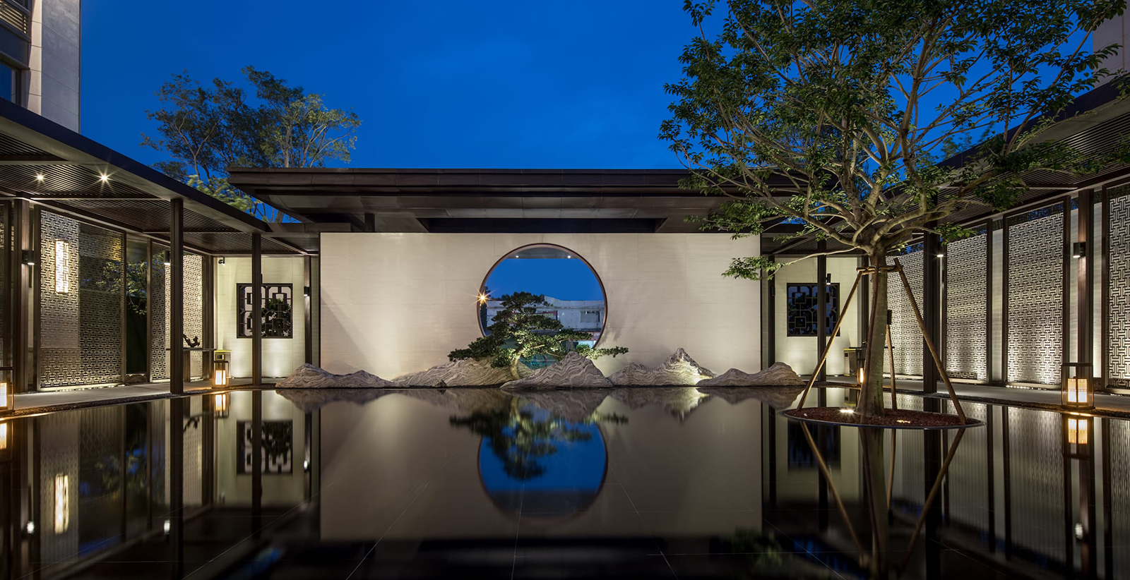 中心水景花園作為中軸核心,東入口向園而行,途徑極具東方雅韻的禪意枯山水,一橋轉(zhuǎn)折入境,借新中式設(shè)計(jì)手法,由虛轉(zhuǎn)實(shí),虛實(shí)絞合,將山水理念融匯其中,鏡水回廊營造水天大境,張弛有度的描繪一幅大氣優(yōu)雅的現(xiàn)代山水畫卷。意境脈絡(luò)從西入口至中園同樣的上演:穿過屏風(fēng)、月洞景墻,藏著一片唯美山水畫境:水廊鏡天、松石浮玉皆歸此園。不分遠(yuǎn)近,不知高下,月洞之后,更像一個(gè)故意的偶然,一點(diǎn)點(diǎn)構(gòu)建游園的驚喜。