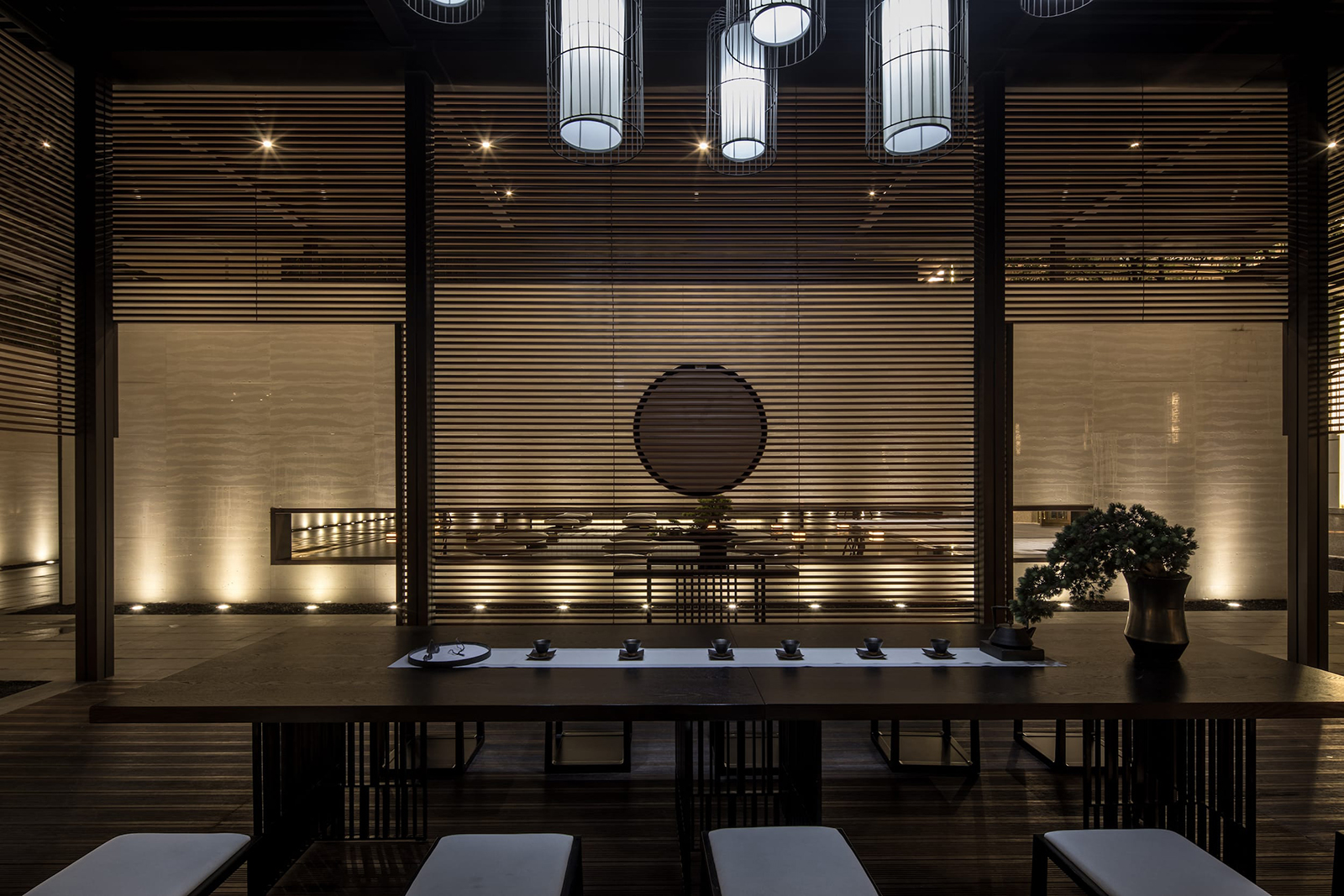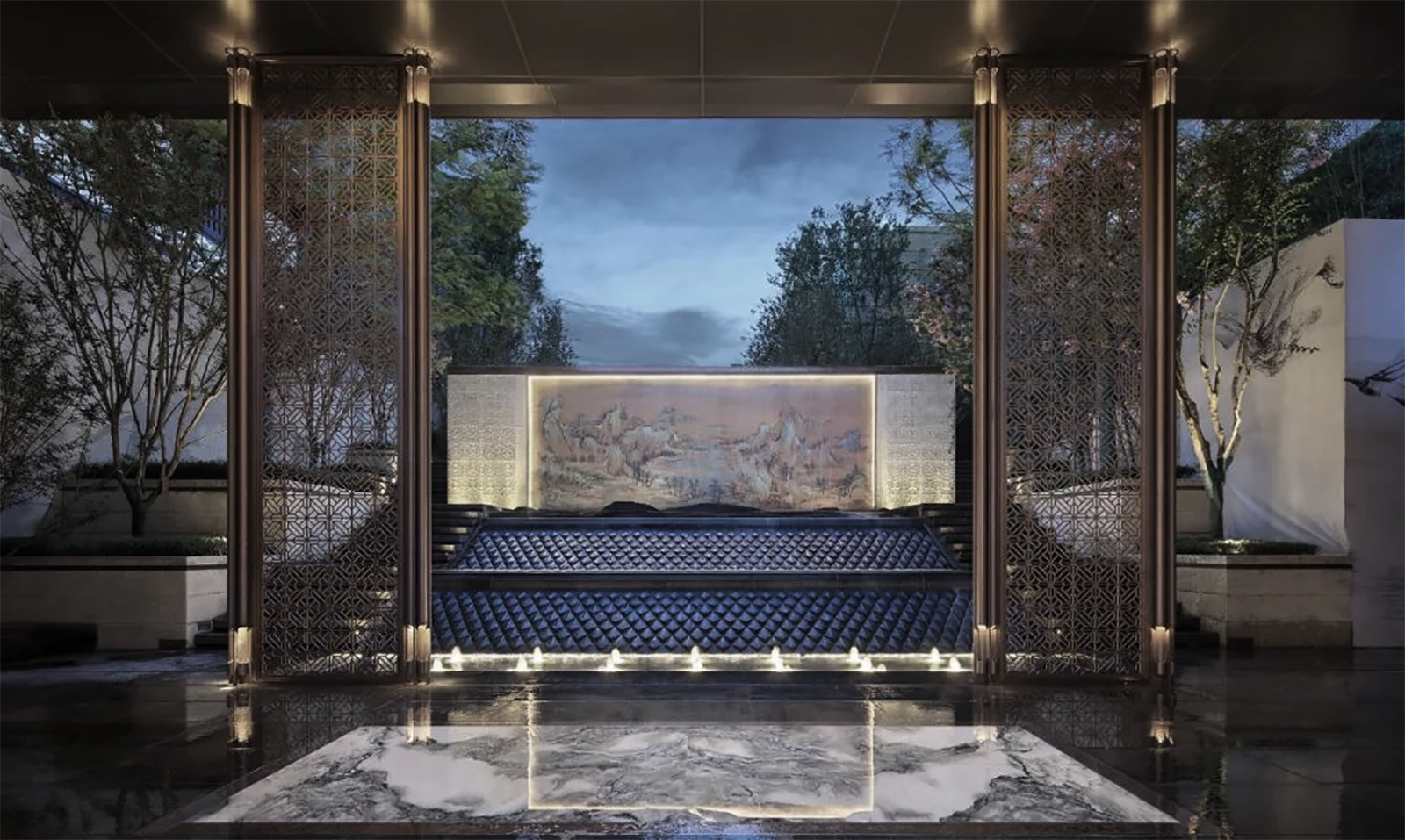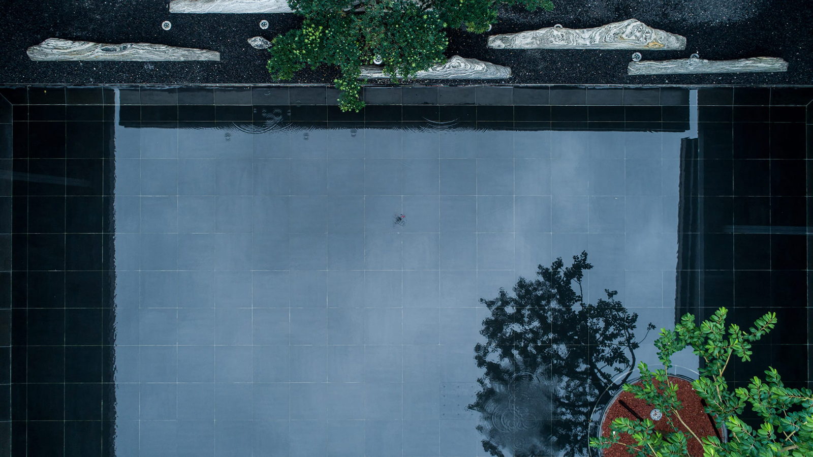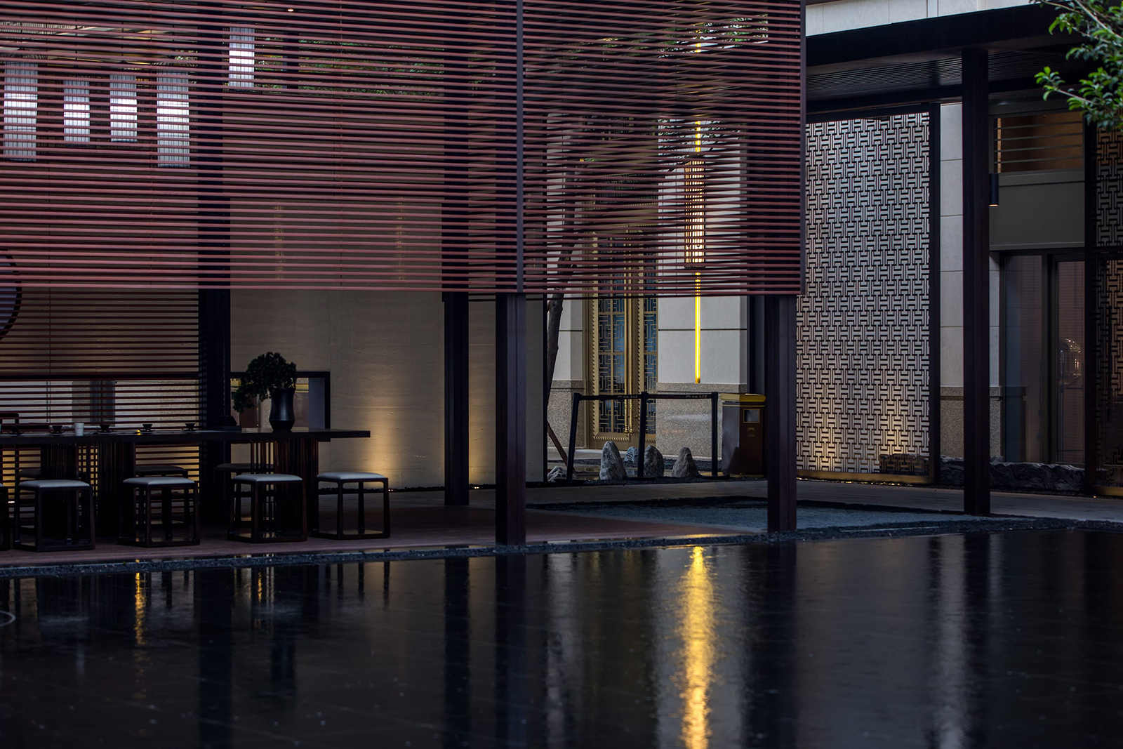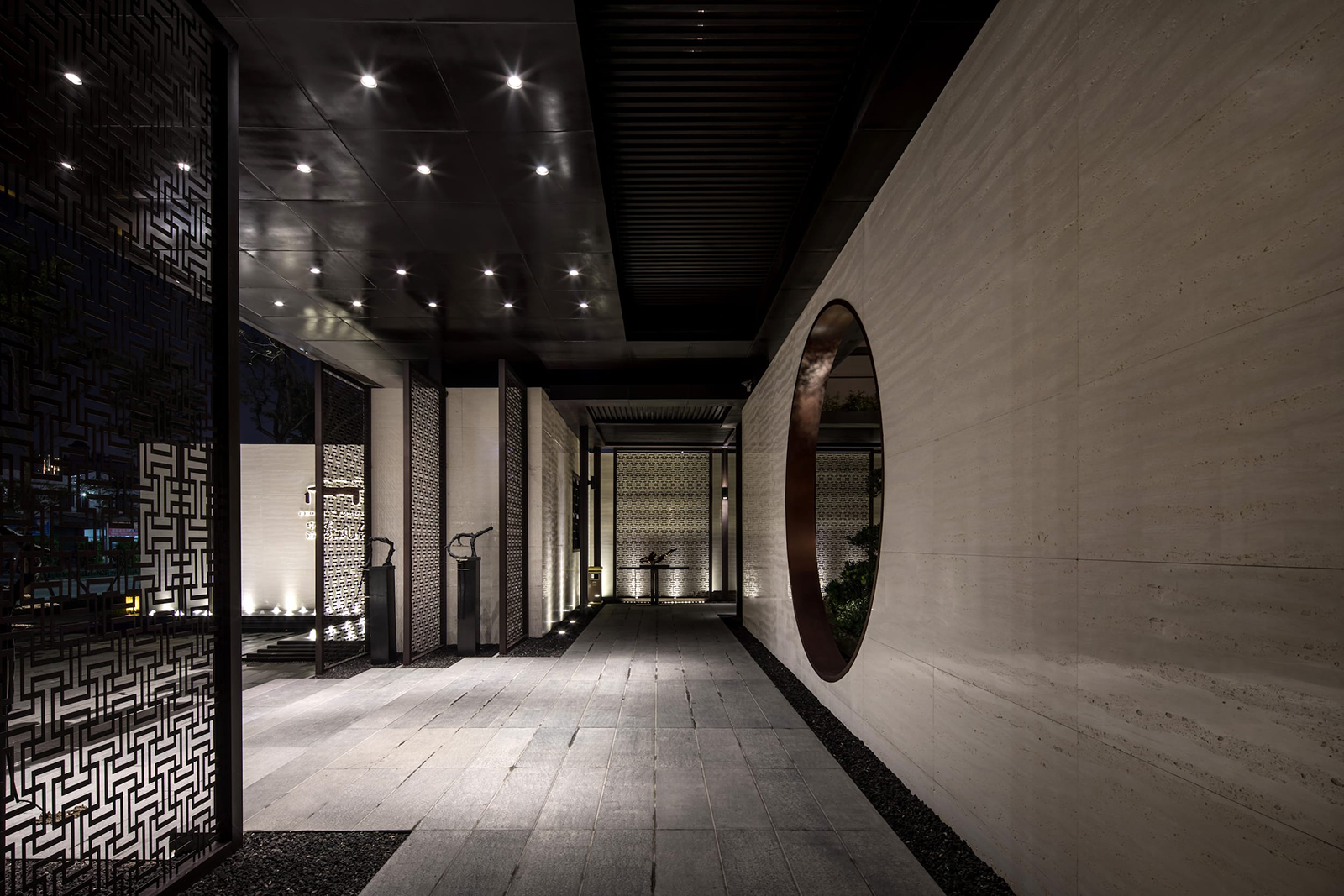 府院境的林泉是文人的林泉,將山水的形意融入到方寸的玉器上是古人表達(dá)喜愛的方式。西入口借助5.45米的內(nèi)外高差,采用六寶歸家禮制,門頭、御燈、光階、疊水、照壁、三山六大景觀元素,禮溯一宅風(fēng)水,規(guī)制禮儀,疊水瑯瑯如玉鳴,千里江山圖絹畫山水照壁,格柵之后設(shè)一池三山枯山水制境,兩側(cè)林蔭成趣,猶如境入山林,將臺(tái)、池、壁、光影等意境提煉、演化并植入場地,再現(xiàn)一幅具有文人林泉形意的現(xiàn)代山水畫卷。