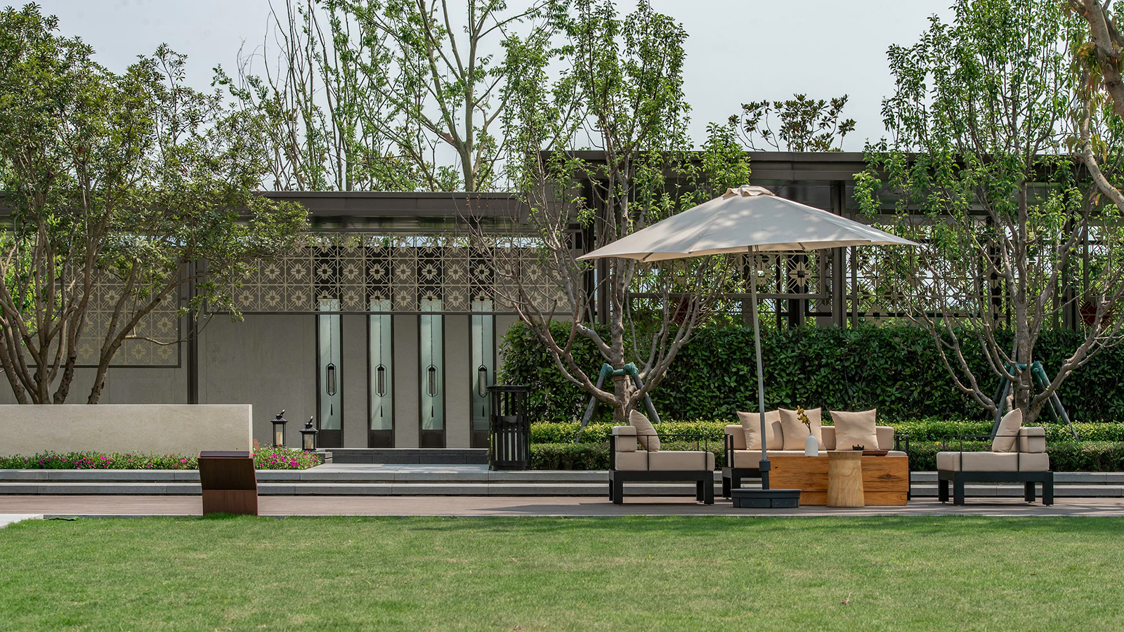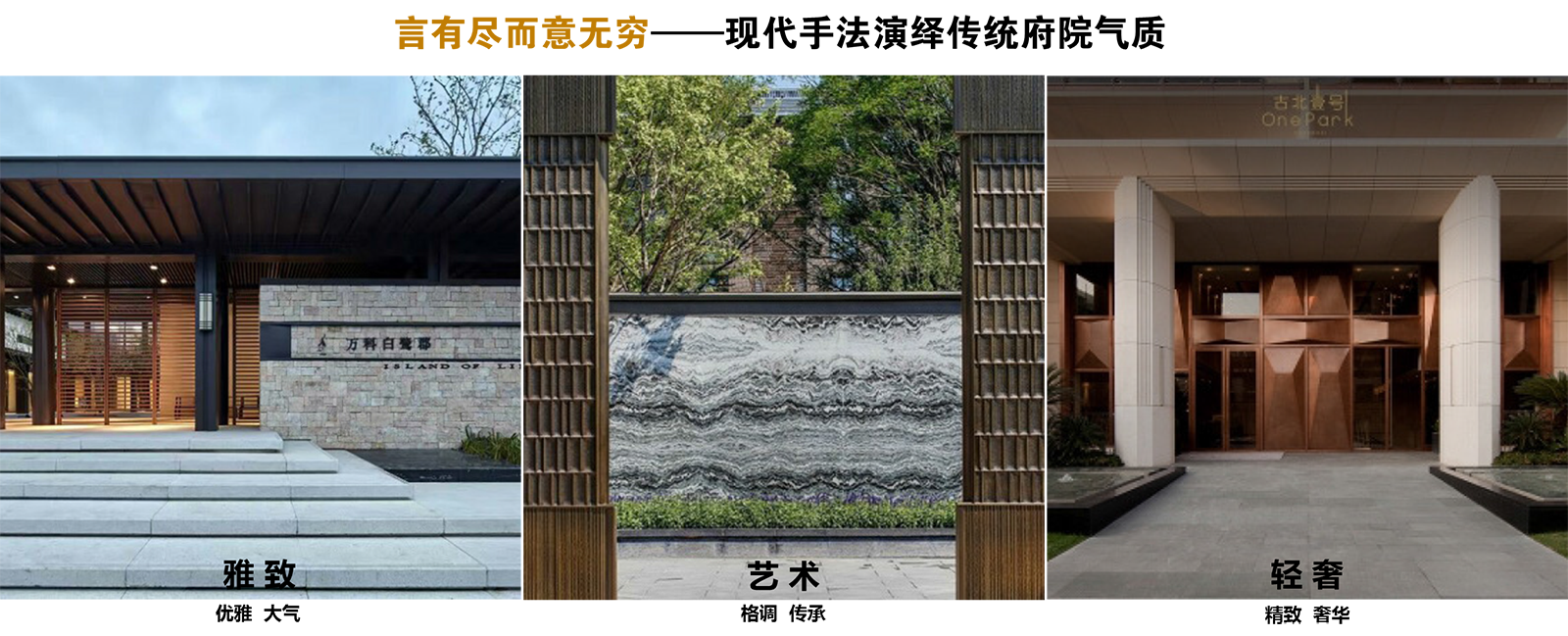 “璽”者:至高無上也,“瑯”從玉,良聲,形容似玉的美石,白玉無暇。汲取“璽瑯”意蘊(yùn)作為文化主題內(nèi)涵,并將其提煉為景觀設(shè)計(jì)元素,以傳統(tǒng)府園文化為基礎(chǔ),延續(xù)文人園林格局。將“天人合一” 的園林思想融入場地,用現(xiàn)代手法演繹中式格調(diào)。在每一進(jìn)空間中,融入展現(xiàn) “玉石氣質(zhì)” 的景觀元素,營造人文、境雅的藝術(shù)化景觀空間。