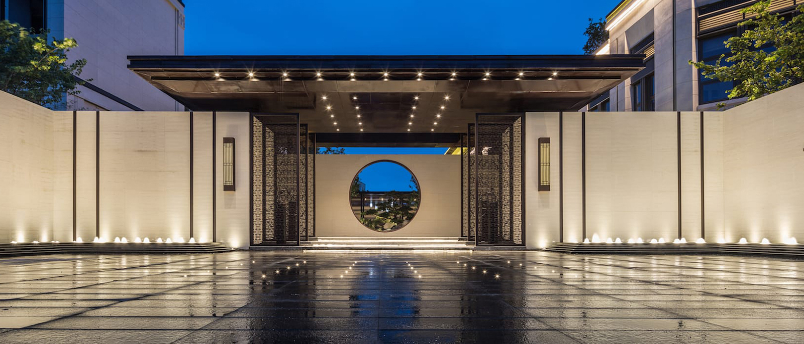 居者歸家,表現(xiàn)一個(gè)府系主題的入口,通常是厚重的。若想舉重若輕的傳達(dá)府園的高貴感,文化意境的融入和儀式感的空間轉(zhuǎn)換應(yīng)不可或缺。