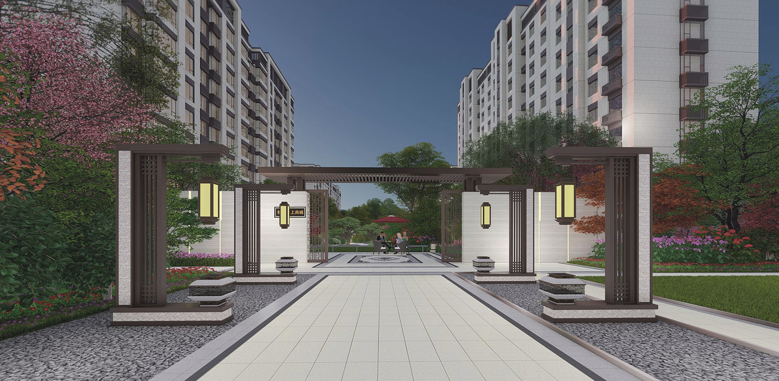 一軸、三進院,五大主題宅間景觀,以顯勢,迎客 、閑游、幸福悅居貫穿始終,采用現代、輕靈的中式設計手法 ,見徐東方意境元素 。