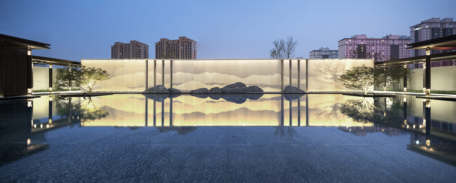 “水利萬物而不爭”,入口府門與造型景石疏導人車動線,以“迎·入境壺天,禮·天宇空明——境·圖云境水”為展示序列,層層遞進??伤^“入則壺天自春”,清凈悠然。對景景墻巍峨大氣,通過風雨連廊,見中軸線大尺度水景,如銀河望月,藏風納氣。水景曲線如群山往復,流水潺潺,禮儀燈光步道,靜謐舒心,大氣、精致、從容。